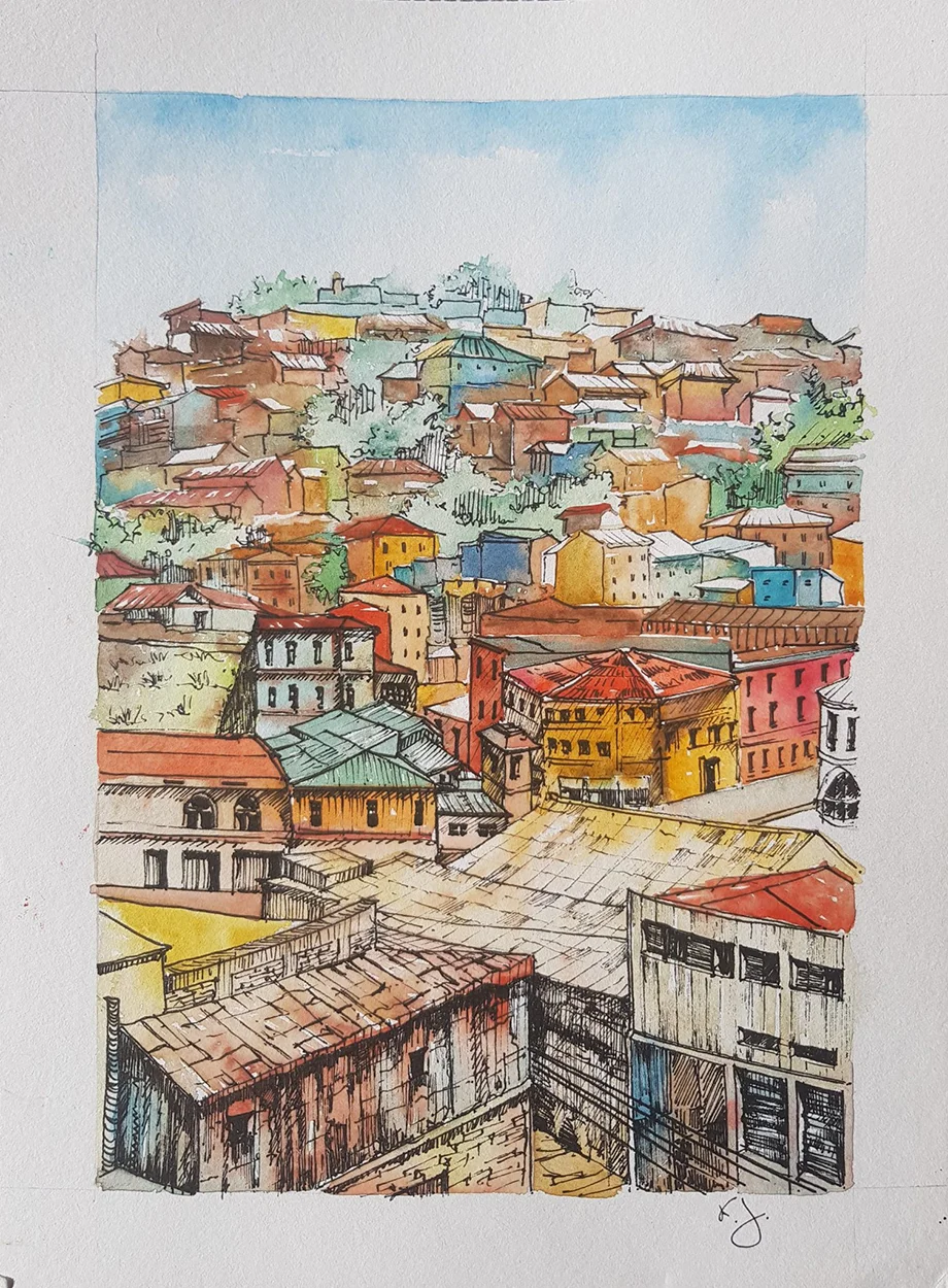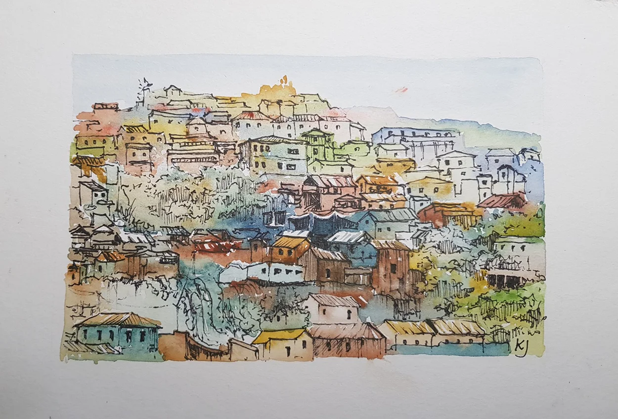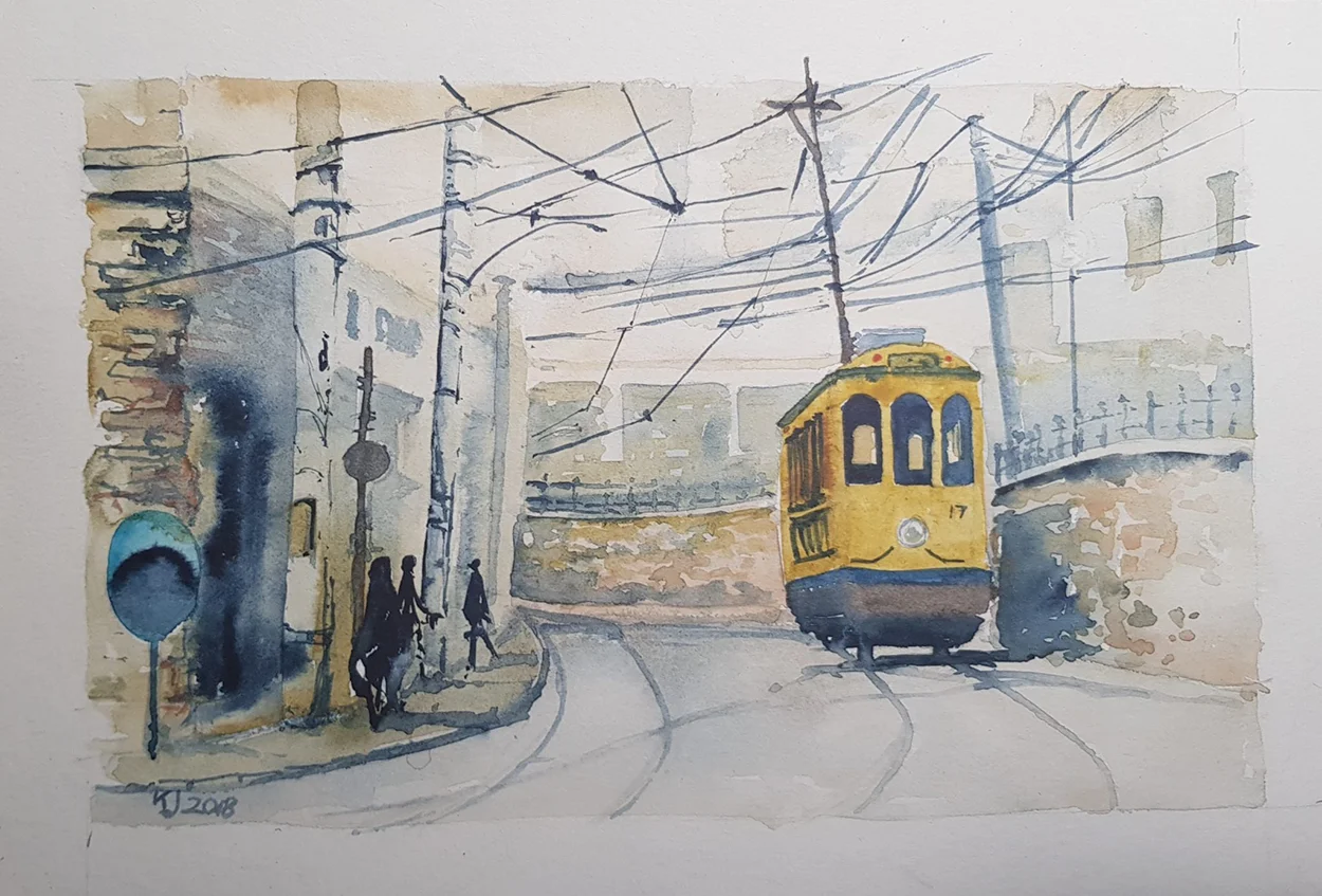 Şimdiye kadar sayısız anı biriktirdik; her biri kendi hikâyesiyle özel. Yolculuklarımız sırasında zaman buldukça — ve ortam uygunsa — Kasia suluboya takımını çıkarıp sessizce çizimlerine dalıyor. Ortaya çıkan işler bazen bir binanın detaylarını, bazen bir sokak lambasının gölgesini, bazen de bir ülkenin ruhunu yansıtan simgeleri bir araya getirdiği renkli kompozisyonlar oluyor. Bazen o anda yaşadığımız bir hissi, bazen de gözümüzden kaçan detayları onun fırçasında fark ediyoruz.